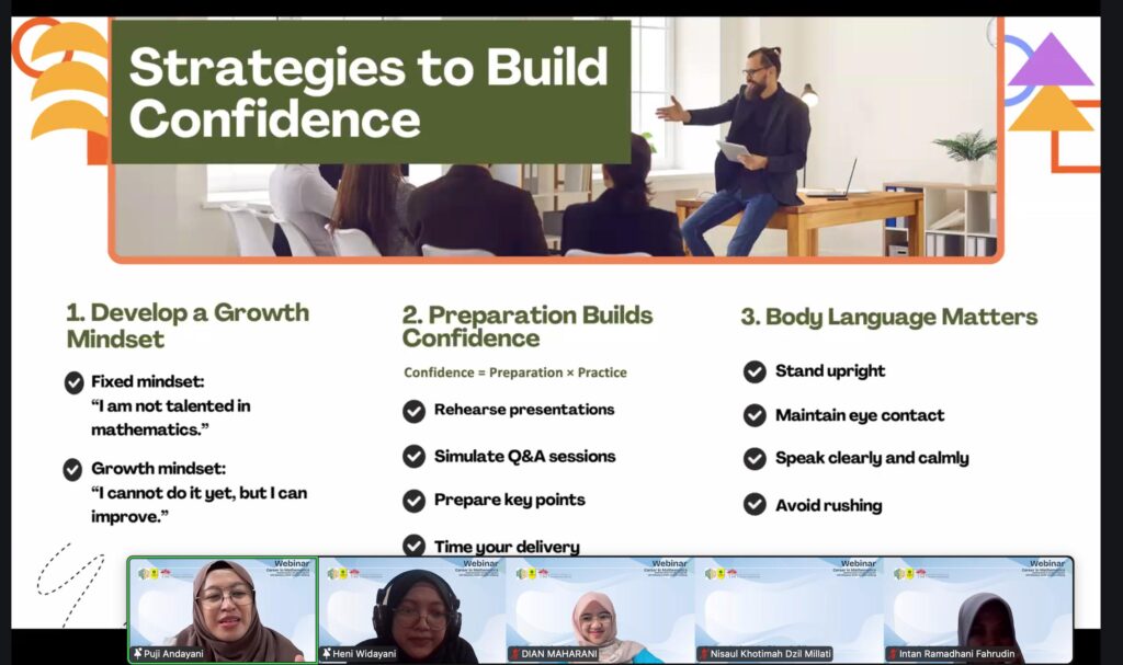 Seringkali, mahasiswa Matematika terjebak dalam Impostor Syndrome atau rasa takut berlebihan dalam membuat kesalahan. Untuk mengatasinya, Puji membagikan strategi membangun kepercayaan diri melalui prinsip: Confidence = Preparation × Practice.